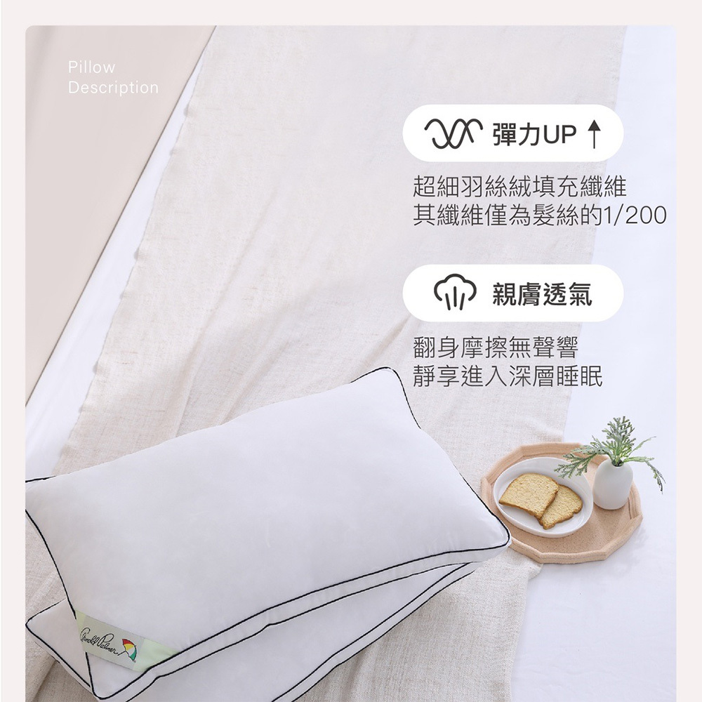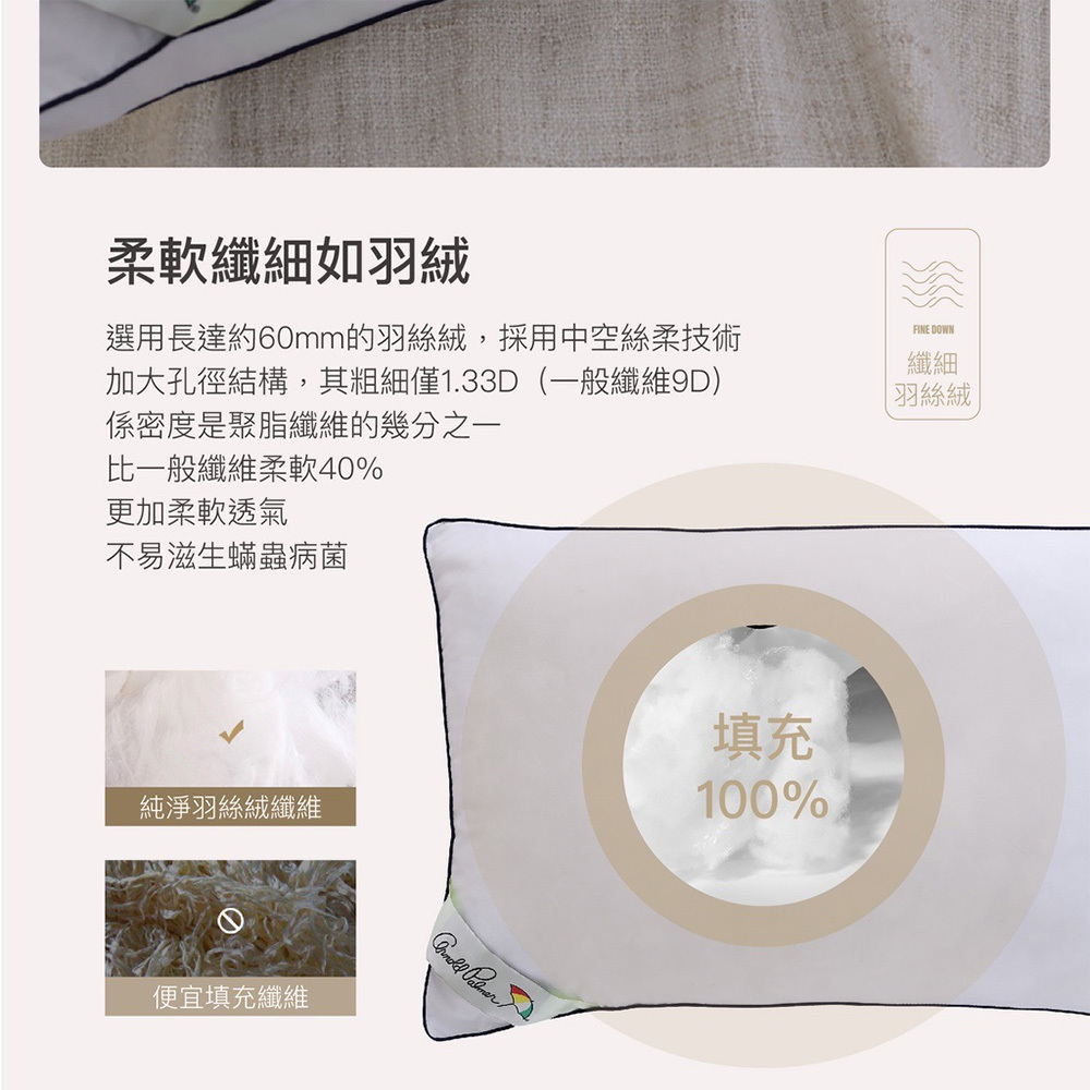 採用進口羽絲絨(中空絲柔技術,加大孔徑結構,柔軟蓬鬆、回彈性能優異,自然貼合人體頸肩,讓您享受五星好眠)